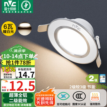自营雷士(NVC)LED筒灯客厅卧室过道嵌入式二级能效全铝漆白6瓦暖白开孔70-85mm