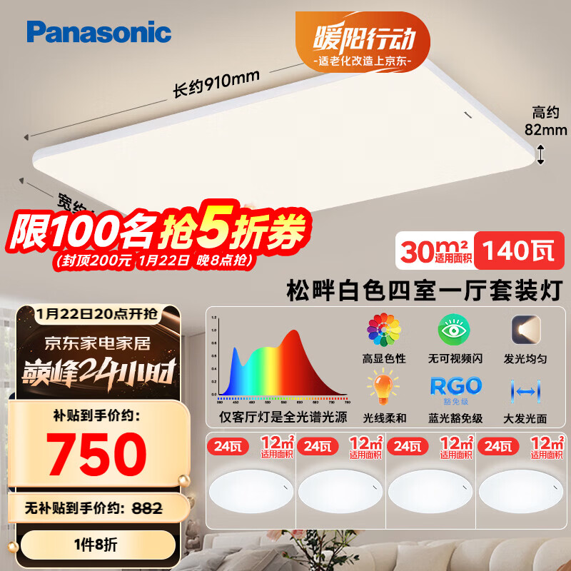 自营松下(Panasonic)全光谱吸顶灯客厅灯超薄护眼 白色松畔四室一厅套装灯