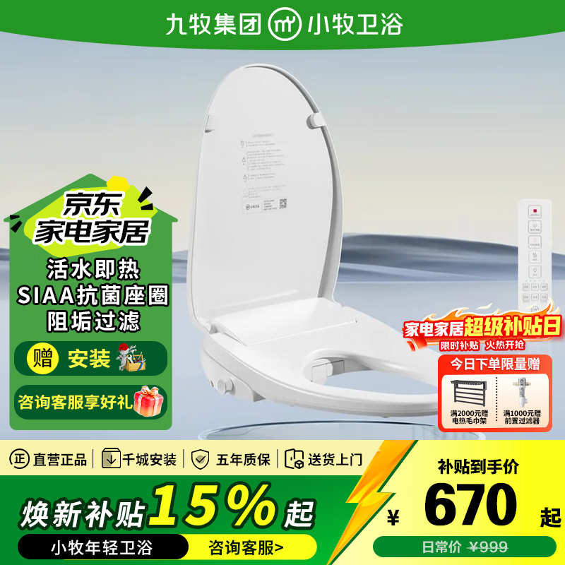 旗舰店九牧(JOMOO)小牧卫浴智能马桶盖全自动遥控暖风烘干活水即热智能坐便盖盖板 S3安装孔距【125-215mm】