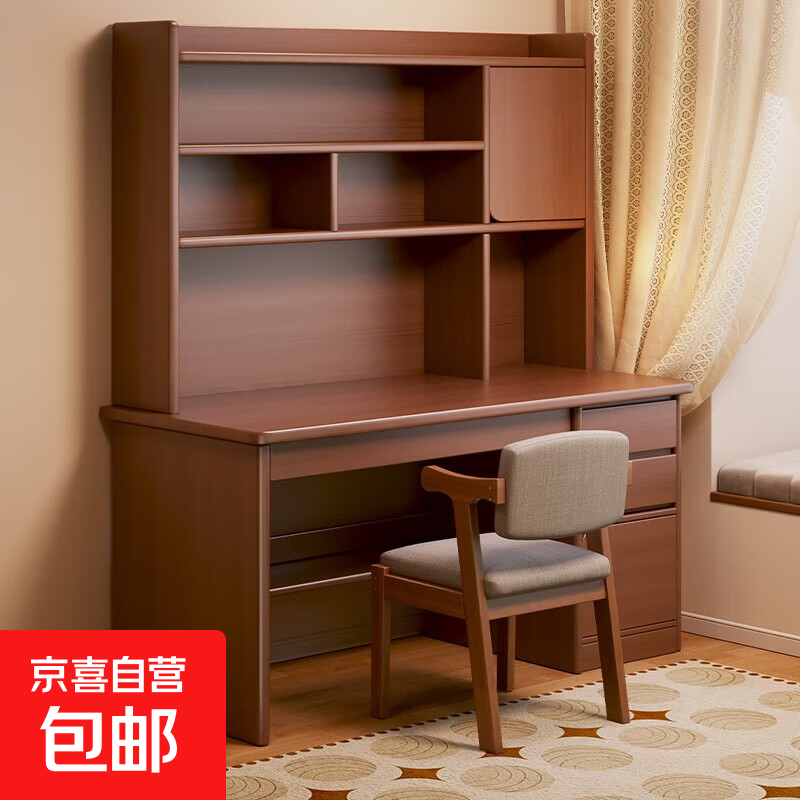 自营实木书桌学生家用学习写字桌卧室书架一体桌子书柜抽屉成人电脑桌 【加厚实木生态板】100cm胡桃色
