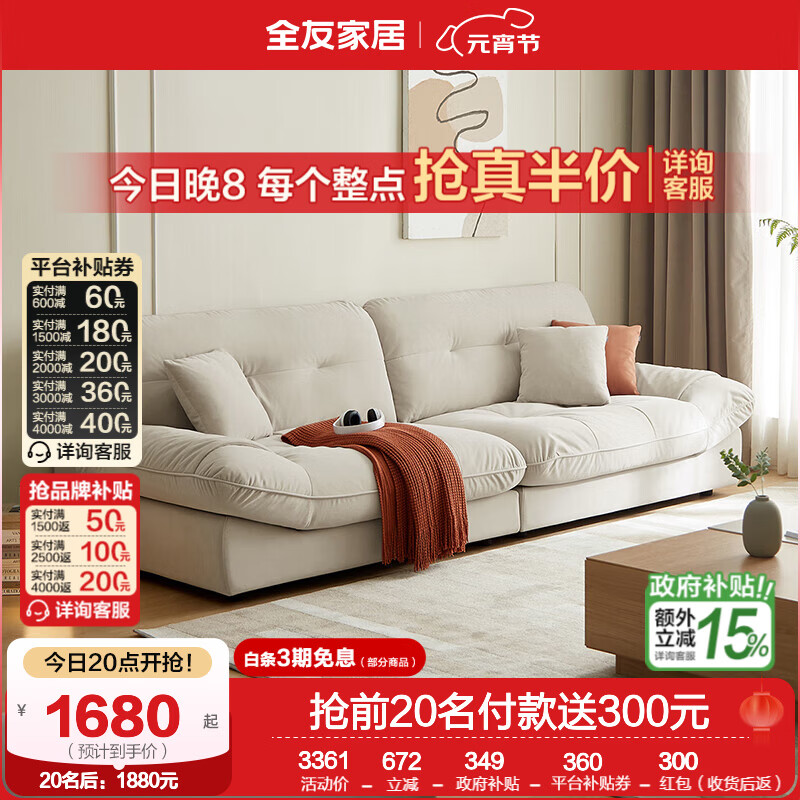 旗舰店全友(QUANU)家居云朵沙发奶油风舒适猫抓布沙发中小户型直排沙发 暖灰|猫抓绒|2.46m沙发