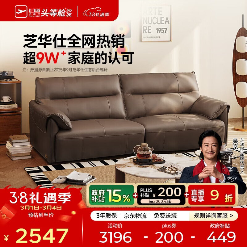 自营芝华仕(CHEERS)真皮艺沙发客厅2025新款小户型双人直排芝华士3095棕双