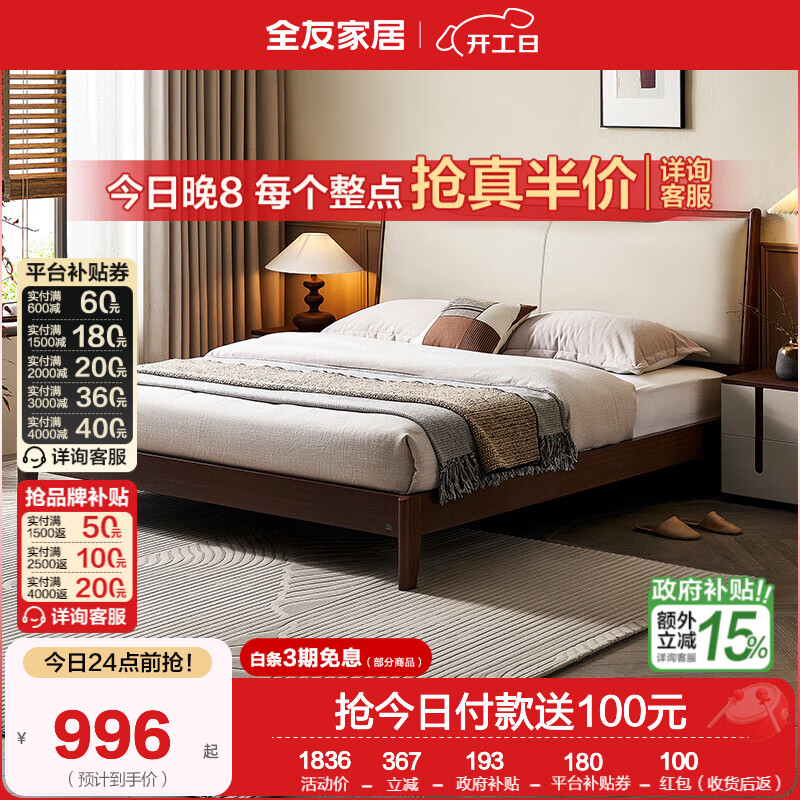 百亿补贴全友家居新中式双人床加高软靠背实木床脚主卧室大床1.8米2米 【高脚款】1.8米床