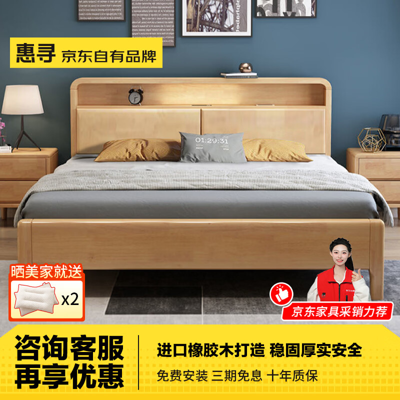 惠寻 京东自有品牌 简约中式床橡胶木实木床单人床双人床婚床主卧家具 单床【送货上门】 1.8米x2米(框架结构)