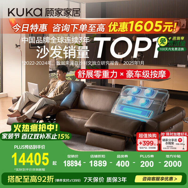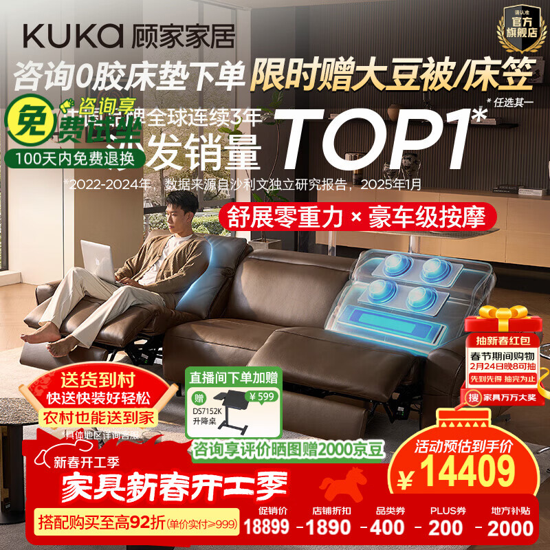 旗舰店顾家家居(KUKA)零重力按摩全皮电动沙发0靠墙进扫地机半青皮26年新款云逸8887 【奢享版|带按摩】热巧咖大三人位2电动3.03M送升降桌
