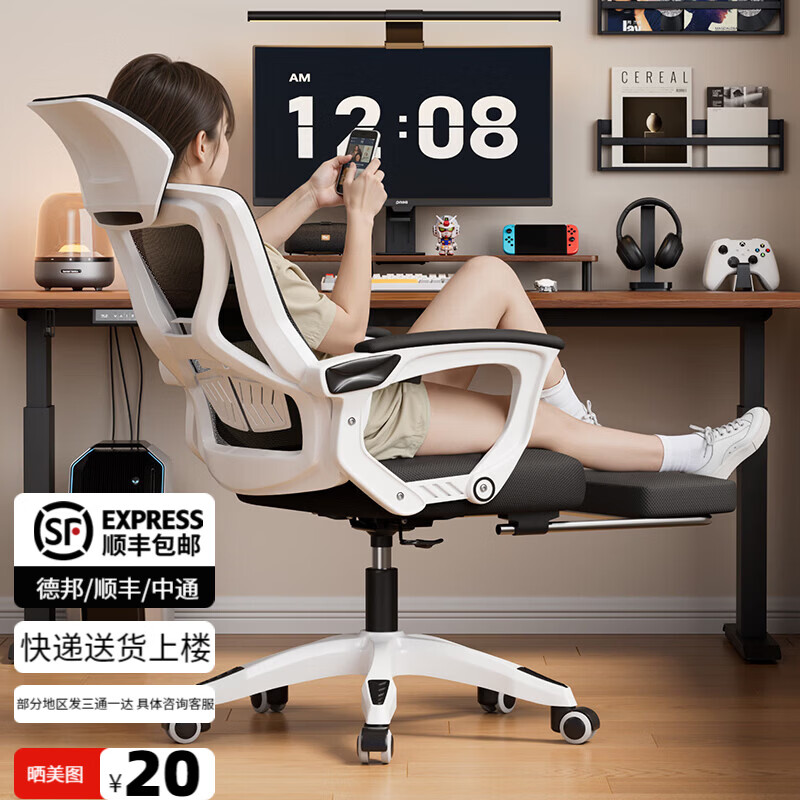 百亿补贴德旭舒服久坐电脑椅午睡两用人体工学办公椅子家用可躺平弓形靠背转椅 白框黑网转椅*海绵款【送货上门*此款无脚踏】