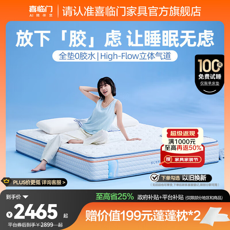 旗舰店喜临门漾pura舒脊透气家用席梦思独袋弹簧0胶床垫 漾pura【整垫0胶/睡感可调】厚26cm 1.8*2米