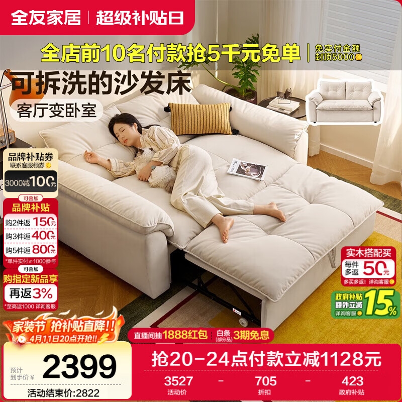 自营全友家居 奶油风沙发床一体两用客厅家用多功能猫抓绒布艺可拆洗沙发