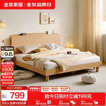 旗舰店全友家居简约原木风板式床主卧室双人高箱储物大床大小户型实木高脚床 高脚|原木色|1.8m床