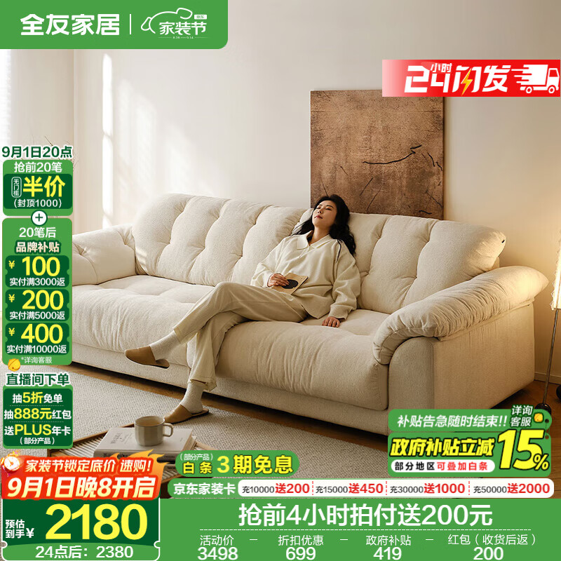 旗舰店全友家居云浪沙发客厅可拆洗布艺沙发小户型2025新款现代简约直排沙发 【京仓闪发】A类面料|雪尼尔|云絮白|2.4m 全拆洗+羽绒+加大坐深