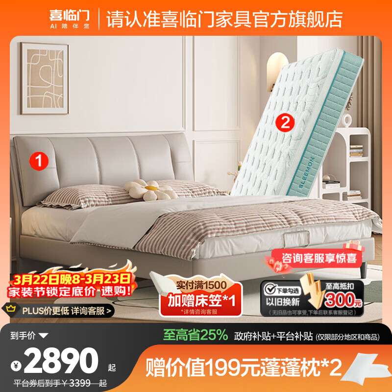 旗舰店喜临门真皮艺双人大床主次卧室现代简约软靠包尼亚pro[床架] 云雾米+云朗air床垫软硬适中-7天发货 1.8*2米