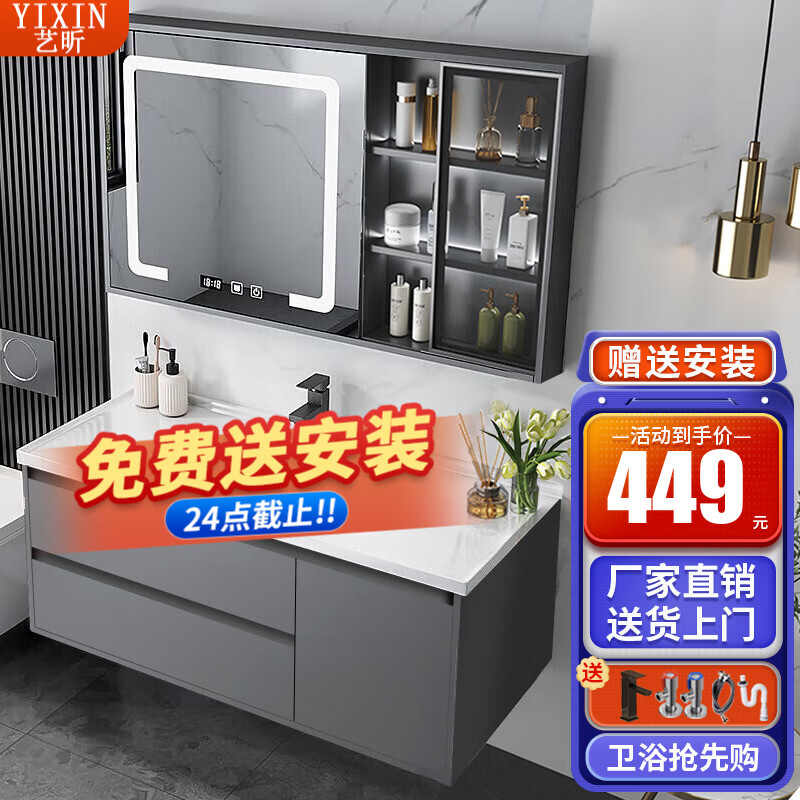 百亿补贴艺昕浴室柜陶瓷一体盆卫生间洗手盆洗脸盆柜组合智能镜套装洗漱洗手台 80CM轻奢灰智能款【活动中】