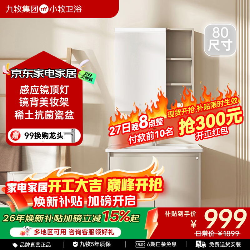 旗舰店九牧(JOMOO)小牧卫浴智能浴室柜卫生间洗手脸盆柜洗漱台实木镜柜MAB0800 80cm【感应镜灯+美妆架 实木】