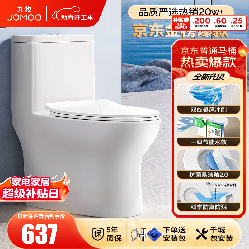 旗舰店九牧(JOMOO)马桶 家用虹吸式马桶大冲力节水坐便器 防臭瞬冲 易洁抗菌马桶 行业爆款-双旋暴风冲11370-305坑
