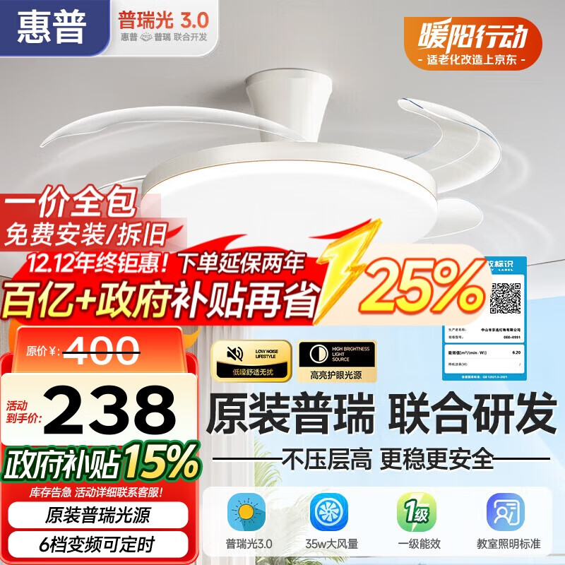 自营惠普普瑞护眼LED风扇灯隐形扇叶遥控调光一体吊扇灯中山灯具包安装