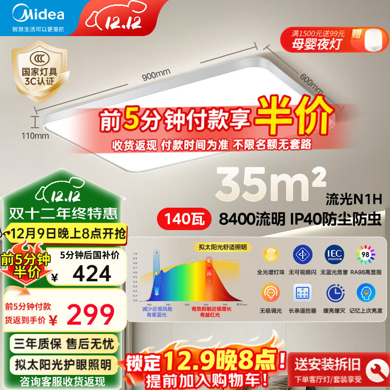 旗舰店美的(Midea)led吸顶灯灯具客厅灯wifi智控调光卧室房间灯全屋灯2025款流光N1H 智控无极调光|140W客厅灯|三防