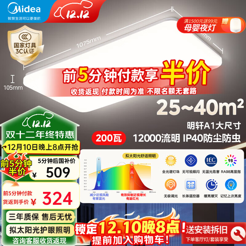 旗舰店美的(Midea)吸顶灯led客厅灯大瓦数高亮三防wifi智控调光全屋灯具明轩A1 智控调光|200W客厅灯|三防