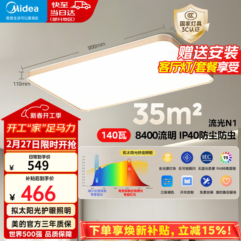 旗舰店美的(Midea)【新品】led吸顶灯客厅灯wifi智控调光卧室全屋灯饰套餐灯具大全 三段调色|140W客厅灯|三防