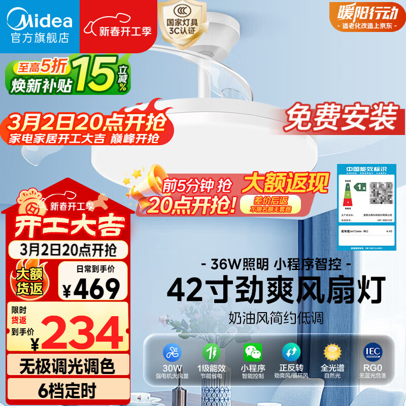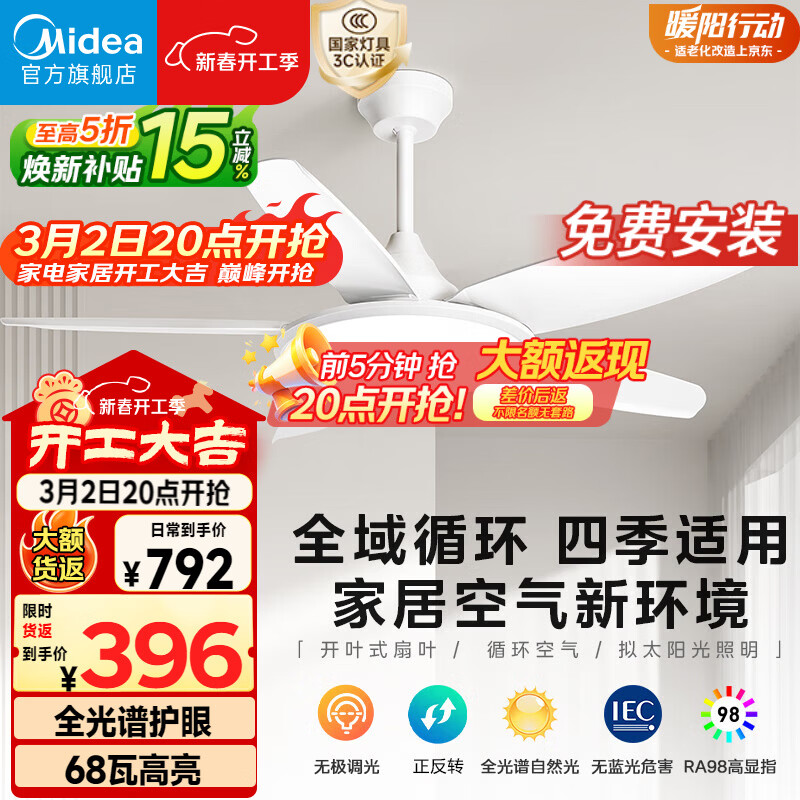 自营美的(Midea)风扇灯一体餐厅吸顶吊扇灯熟睡风led卧室三防白光护眼36寸包安装