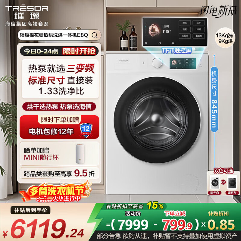 旗舰店海信(Hisense)璀璨棉花糖热泵洗烘一体机E8Q-1 全家筒全自动滚筒洗衣机 大容量健康活水洗WH130E8Q-1 以旧换新 白色