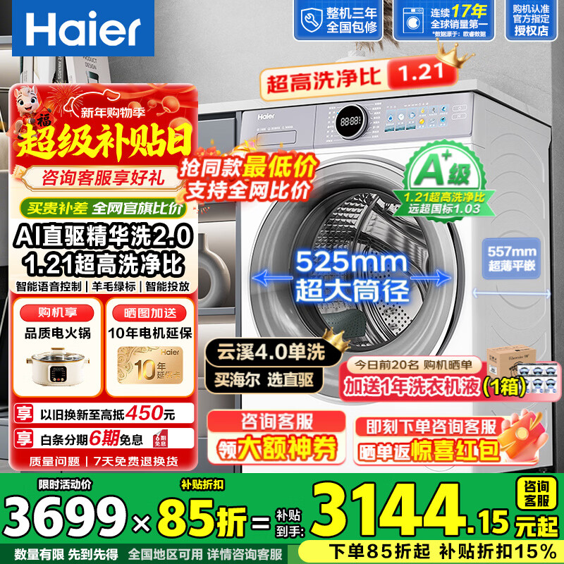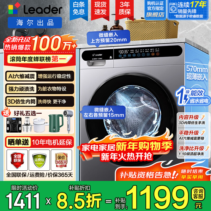 旗舰店海尔(Haier)【新品补贴20%】10公斤洗衣机带烘干滚筒 全自动变频洗烘一体家用大容量一级能效超薄平嵌六维减震 银色洗脱一体|1.1洗净比|羊毛洗双喷淋