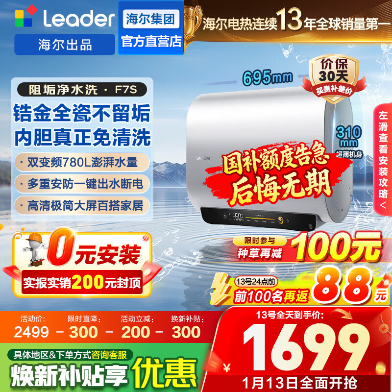 旗舰店海尔(Haier)智家出品Leader统帅懒人热水器电热水器阻垢净水洗F7S扁桶双胆出水断电60升一级能效内胆免清洗 60L 3300W 25年新品阻垢净水洗F7S