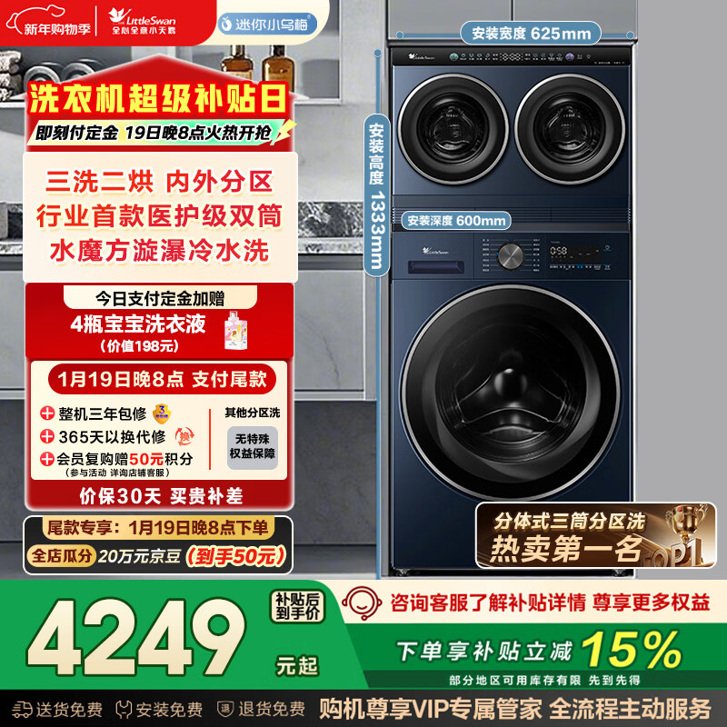 自营小天鹅(LittleSwan)迷你小乌梅 懒人三筒洗衣机 滚筒洗衣机全自动 2+10KG 可叠放自由组合 内衣洗衣机 三桶 国家补贴