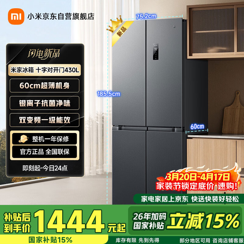 自营米家小米430L十字门冰箱一级能效变频家用超薄抗菌净味60cm超薄机身京东自营BCD-430WSMP国家补贴