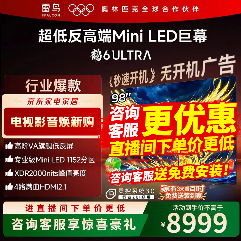 旗舰店FFALCON雷鸟电视98鹤6 Ultra 25款 98/100英寸 MiniLED 高阶VA 家电国家补贴电视98S595C Ultra 平板电视 98英寸 国家补贴