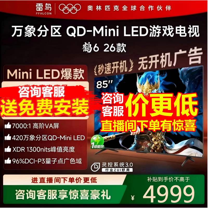 旗舰店FFALCON雷鸟电视鹤6 26款 85英寸万象分区QD-MiniLED1300nits 高阶VA安桥音响288Hz高刷 85英寸 平板电视 85英寸 国家补贴 85R69A