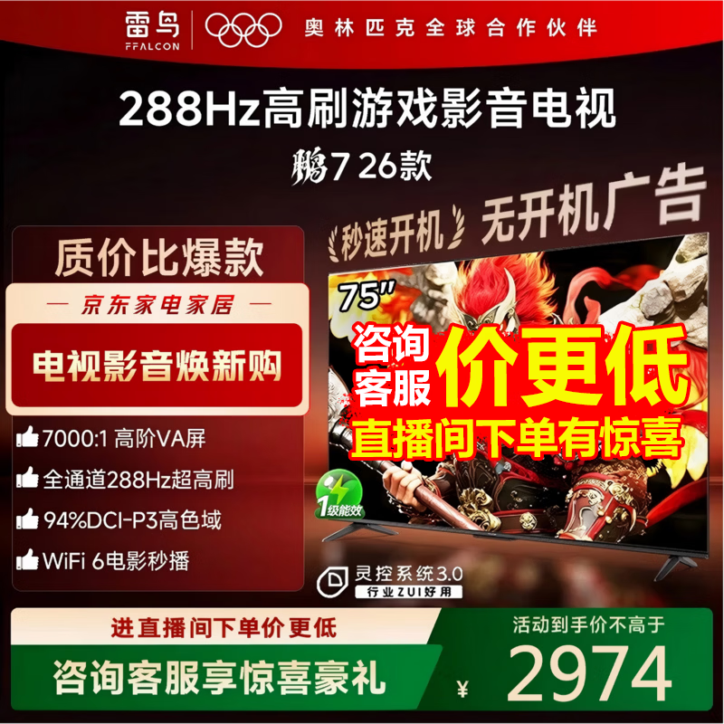 旗舰店FFALCON雷鸟电视鹏7 26款 75英寸高阶VA全通道288Hz高刷 满血HDMI2.1 94%P3色域 灵控系统 75英寸75S78A 75英寸 国家补贴 75S78A