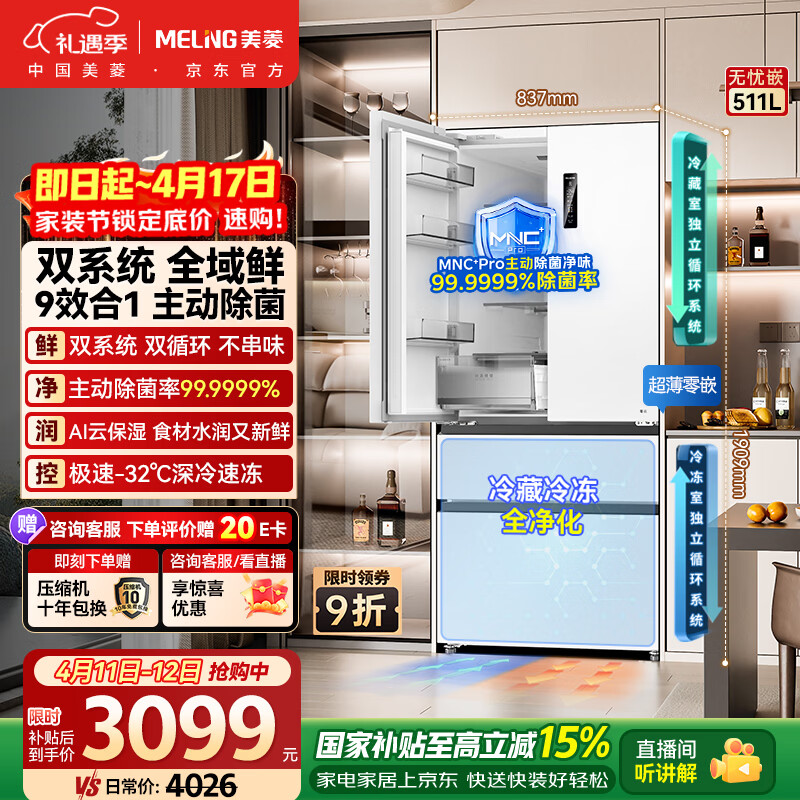 自营美菱无忧嵌511L法式多门冰箱超薄零嵌入双系统主动净味底部散热节能风冷无霜BCD-511WFP9CZX国家补贴