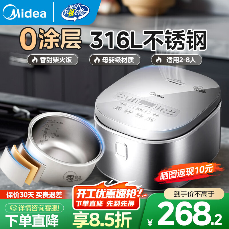 旗舰店美的电饭煲0涂层电饭锅家用4升 316L不锈钢内胆 多功能微压智能预约无涂层电饭煲2-3-4-5-8人政策补贴 【母婴级不锈钢内胆】 4L