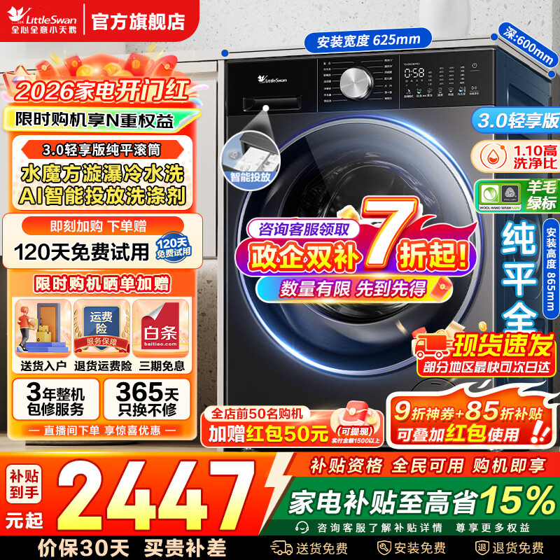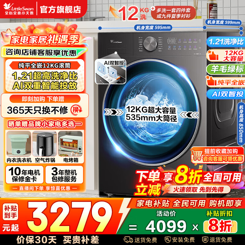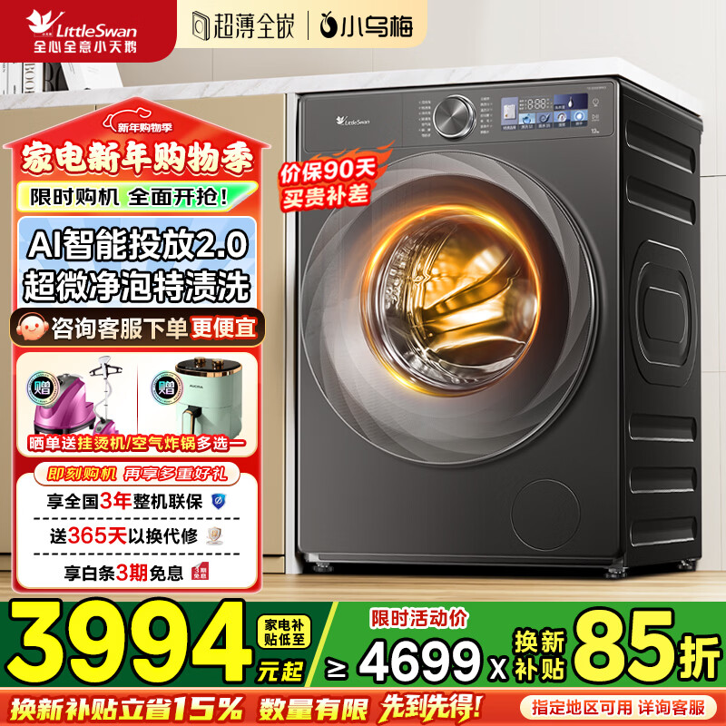 旗舰店小天鹅(LittleSwan)小乌梅2.0/小乌梅3.0滚筒洗衣机全自动12公斤洗烘一体机 纯平全嵌智能投放1.21洗净比 家电补贴 【小乌梅2.0带烘干】超微净泡+纯平全嵌 洗烘一体
