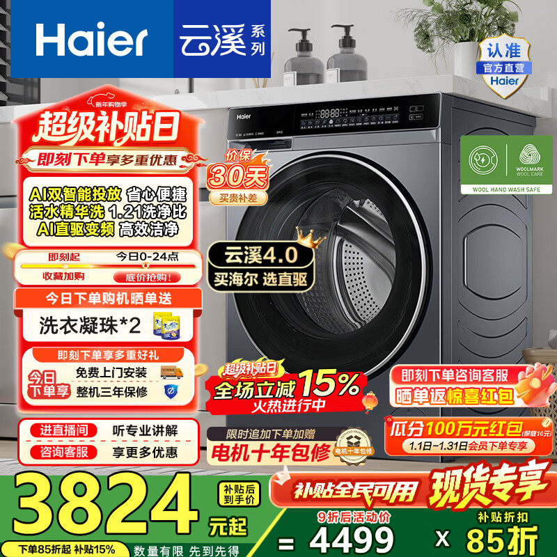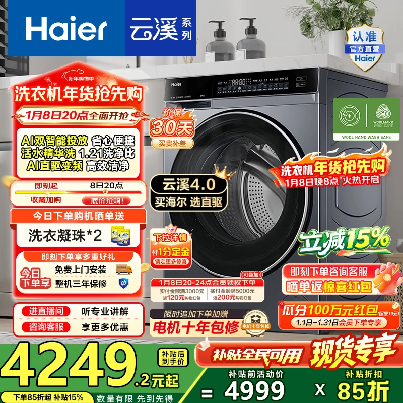 旗舰店海尔(Haier)云溪4.0滚筒全自动洗衣机10公斤AI升级家用大容量直驱变频 双智投73K相似款582HU1家电换新补贴15% 【云溪4.0】582高端单洗丨25年全新升级 滚筒