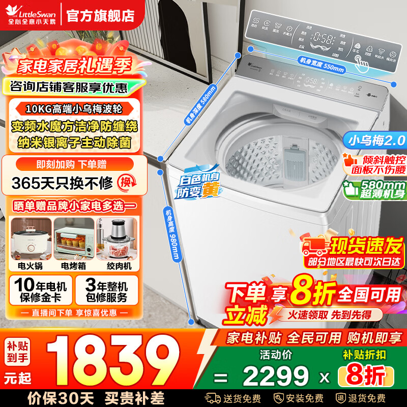 旗舰店小天鹅(LittleSwan)小乌梅2.0波轮洗衣机全自动 水魔方防缠绕 直驱变频 家用10公斤一级能效 以旧换新 家电补贴 【轻奢版】高端销冠水魔方+银离子除菌+羽绒服特色洗