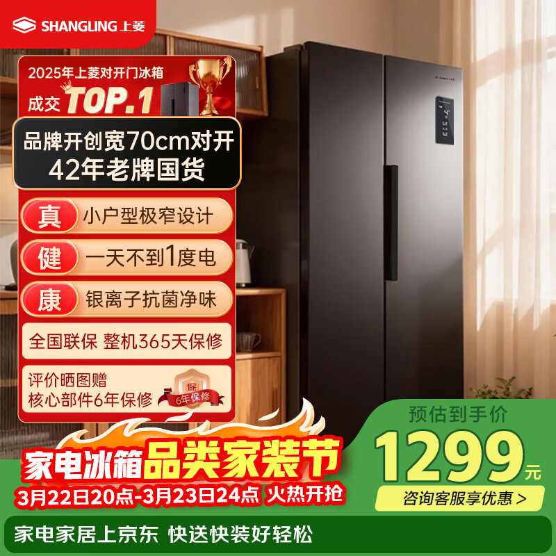 自营上菱447升对开门冰箱双开门 宽70厘米一级能效国家补贴变频风冷家用电冰箱以旧换新BSE447PWL