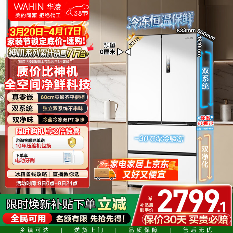 自营华凌美的出品神机521L法式多门60cm超薄零嵌冰箱双系统一级能效双变频风冷无霜HR-547WUFPZ国家补贴