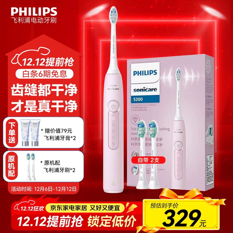 旗舰店飞利浦(PHILIPS)【肖战推荐】电动牙刷钻石3系声波震动牙刷微泡水流科技送女男朋友情侣礼物 HX5171/04 水晶粉