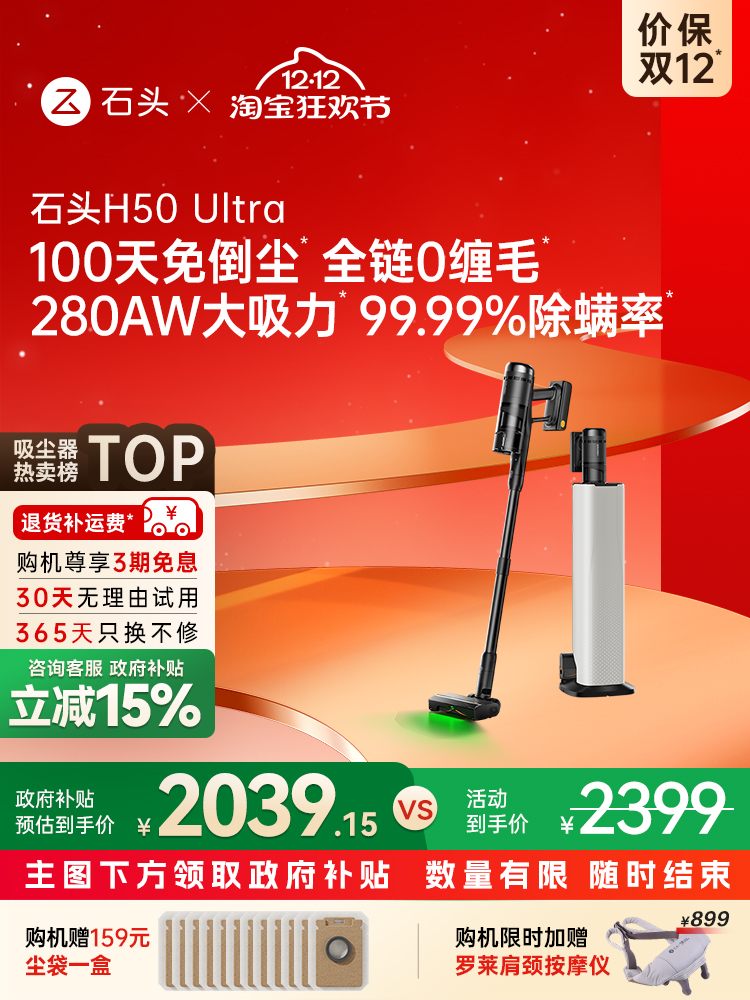 百亿补贴【全国补贴15%】石头无线手持家用无线吸尘器H50Ultra大吸力除螨