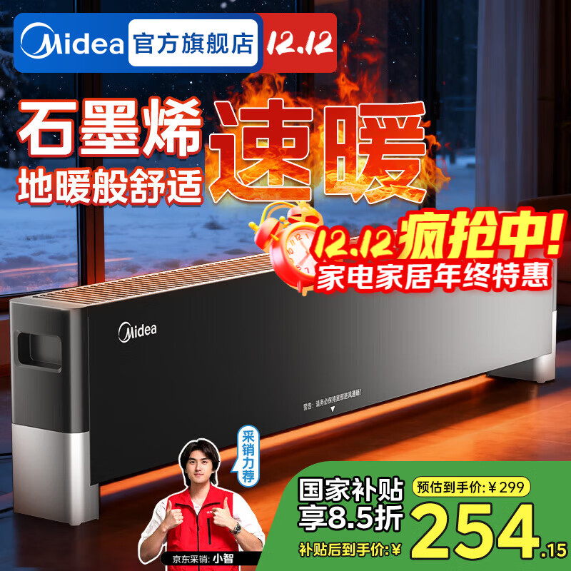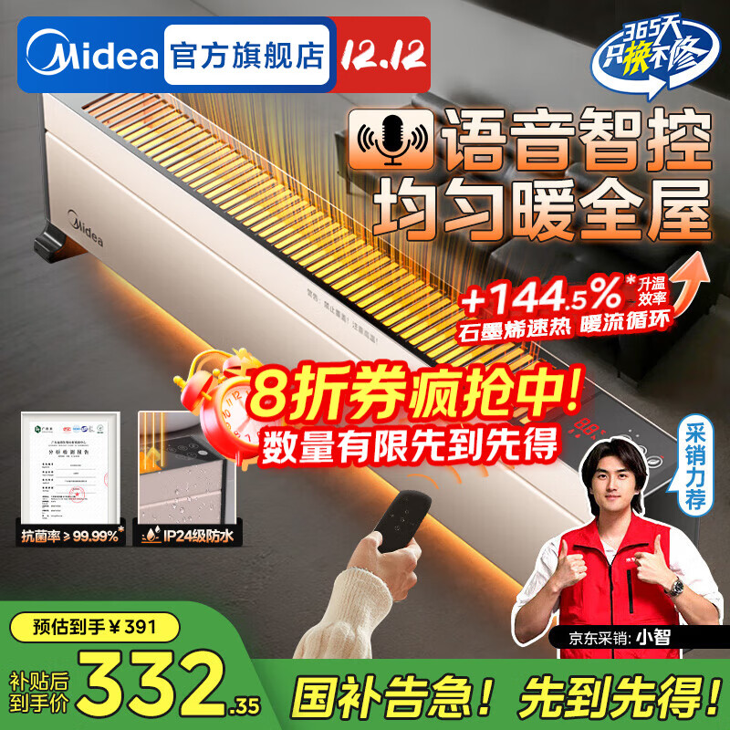 旗舰店美的(Midea)石墨烯踢脚线电热取暖器电暖气家用电暖器节能地暖客厅暖风机全屋取暖神器大面积 【抗病菌石墨烯 语音控制 】ECO省电