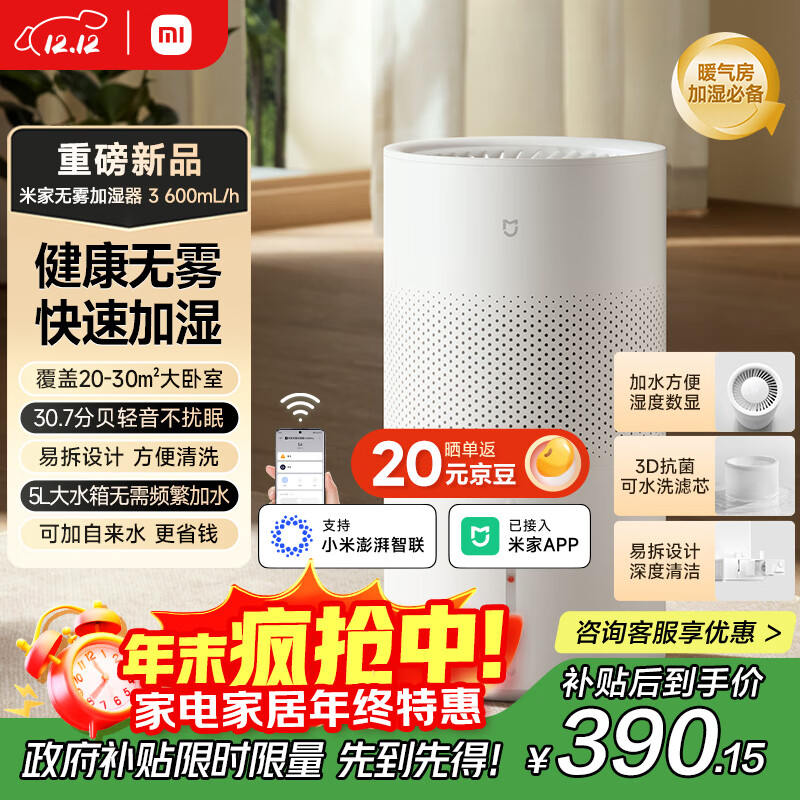 自营米家 小米空气加湿器 无雾加湿器3 600mL/h快速加湿 家用卧室大容量 办公室婴儿孕妇 5L大容量