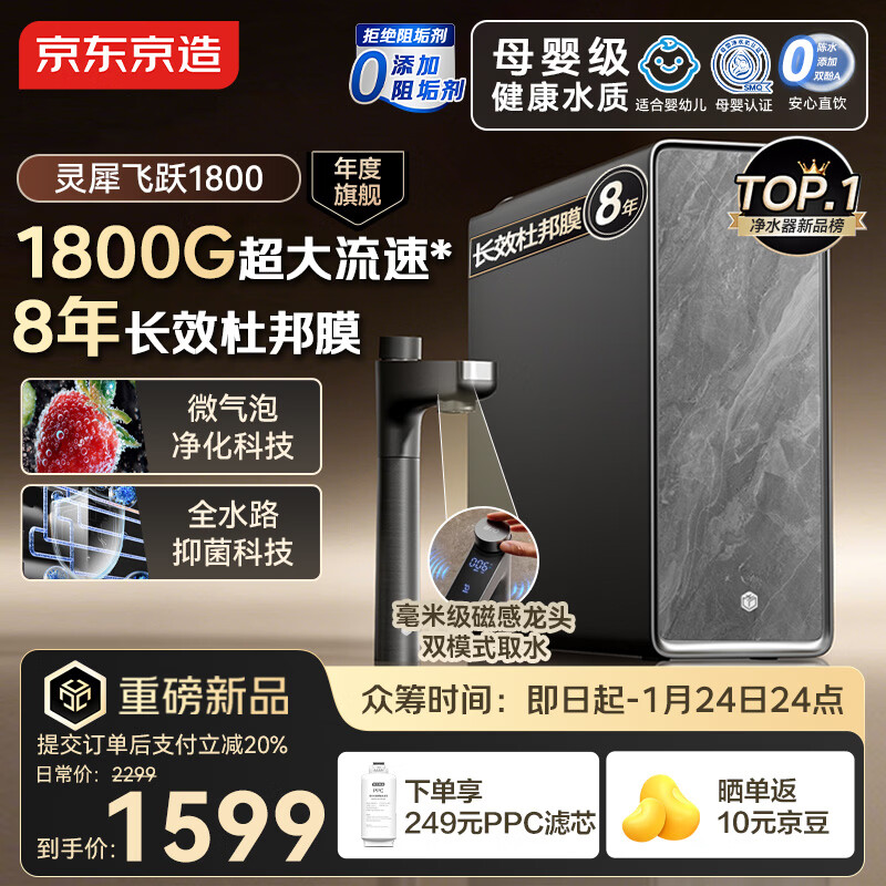 自营京东京造净水器家用灵犀飞跃1800 0阻垢剂 杜邦陶氏RO母婴反渗透1600G通量初始4.75L/min流速家电国家补贴
