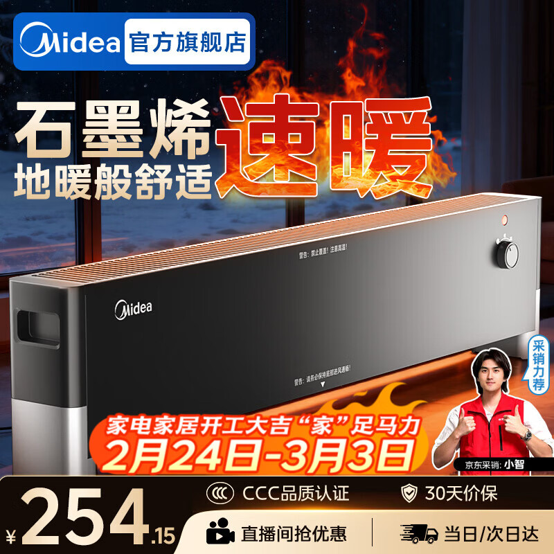 旗舰店美的(Midea)石墨烯踢脚线电热取暖器暖风机超薄风暖大面积电暖气家用浴室电暖器地暖全屋升温 【抗病菌石墨烯 对流循环】速热升温 HDT22YY