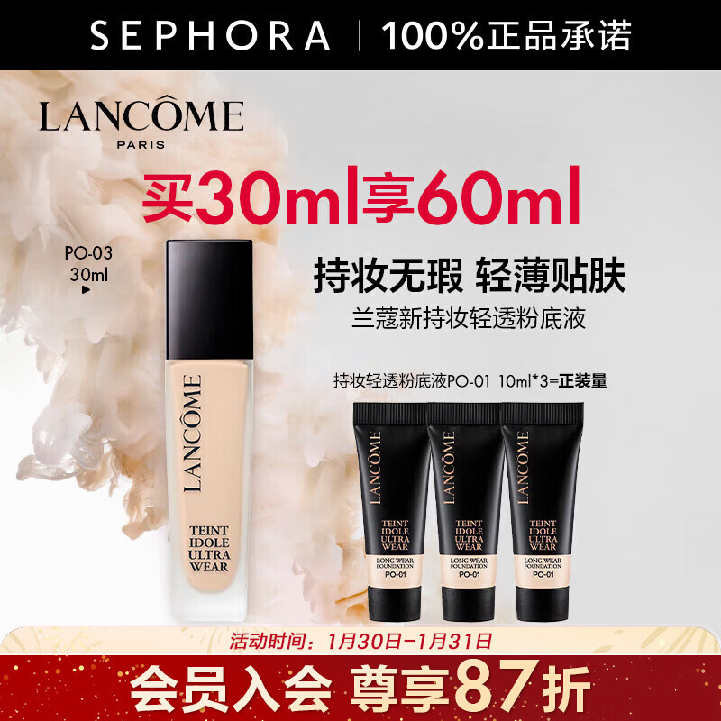 旗舰店兰蔻(LANCOME)新持妆轻透粉底液 持久遮瑕保湿隔离油皮控油轻薄 第二代 PO-03,买30ml赠PO-01粉底液30ml