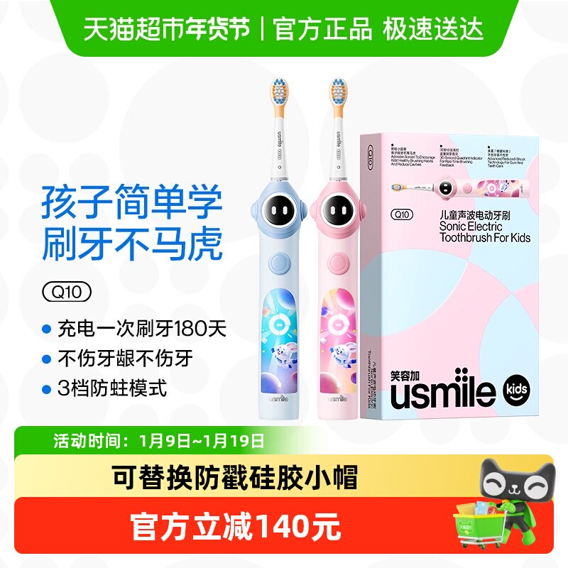 笑容加usmile儿童声波电动牙刷Q10充电3-12岁卡通小帽刷软毛牙刷
