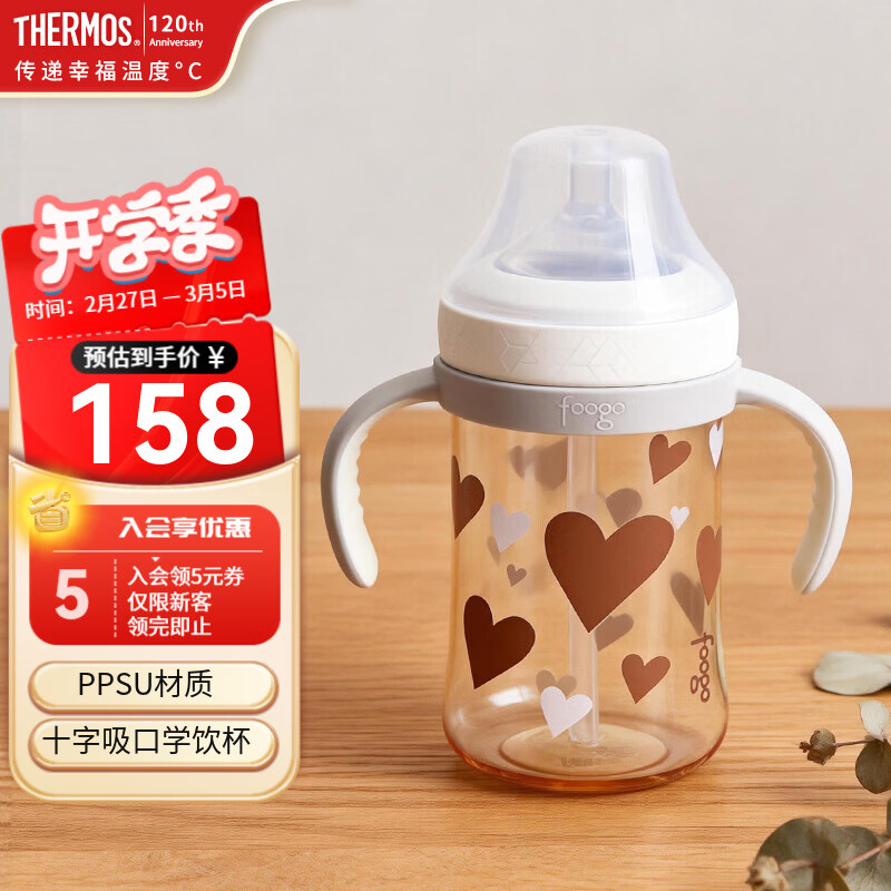 旗舰店膳魔师(THERMOS)儿童水杯PPSU直吸学饮杯奶瓶婴幼儿带把手十字防呛喝奶瓶宝宝水杯 【爱心】直吸学饮杯330ml FCPC