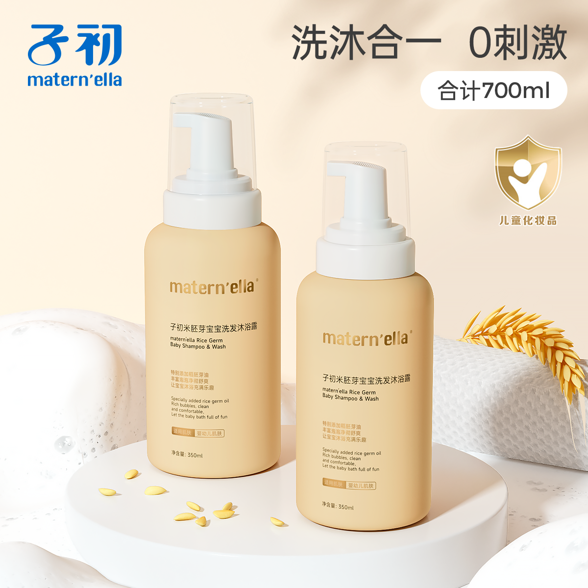 旗舰店子初米胚芽婴幼儿婴童洗发沐浴露二合一350ml组合全季节清洁套装