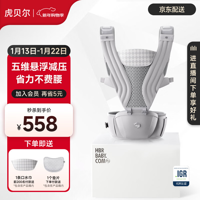 虎贝尔AIR经典减压悬浮腰凳婴儿背带宝宝轻便四季多功能抱娃神器减压 AIR经典减压腰凳-银雾白