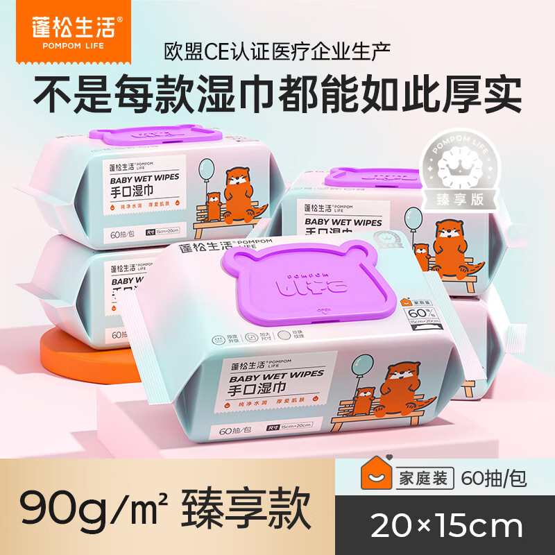 旗舰店蓬松生活 母婴手口湿巾加厚清洁屁屁 产妇湿巾纯水 产后护理清洁湿巾 【90g加厚款】60抽5包
